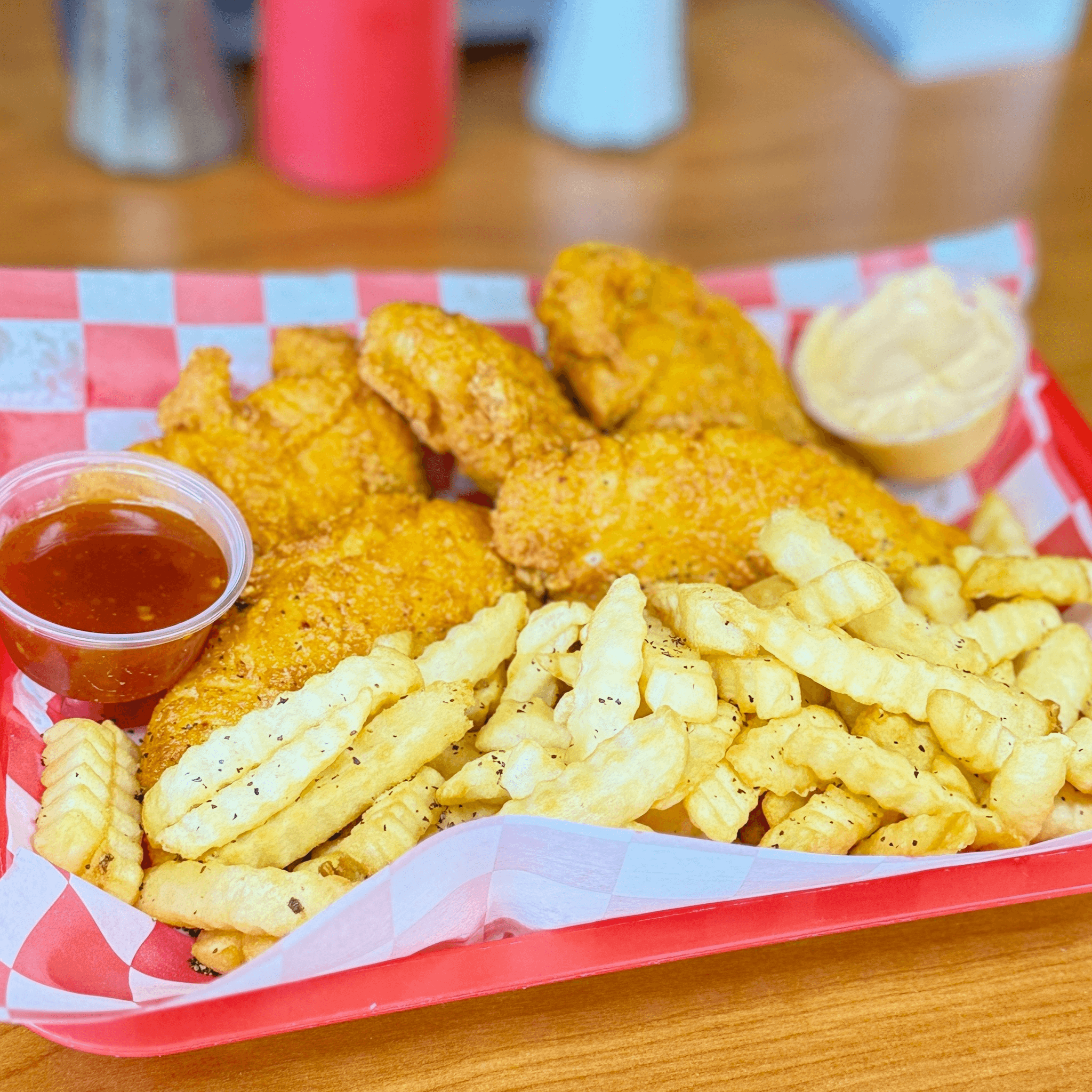 Non Frozen Whiting Fish Fried Served with Crinkle Fries and Choice of White or Potato Bread